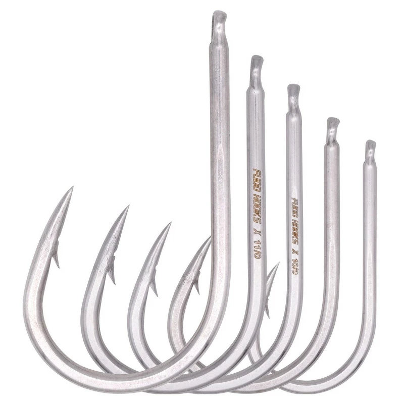FUDO Super Ocean (formerly X-Strength) Curved Needle Eye Hooks are commercial-grade Southern Style “Tuna Bend” hooks, offering superior strength and sharpness. Forged and constructed of stainless steel, these hooks are produced and hand formed in Kobe, Japan to exacting standards. These hooks stem from the desire to build a stronger hook that won’t bend at the throat or break at the tip when the fish of a lifetime is on the line. The extra strength is achieved through heavier gauge wire; each size hook benefits from the gauge of the next size up, adding only an additional 0.25mm to the diameter. Once constructed, Fudo adjusts the time and temperature for the tempering process to achieve added strength. Conservatively speaking, these hooks are 2x strength. The conical point of FUDO Super Ocean Needle Eye Hooks are sticky sharp and provide excellent penetration capabilities. Each hook is hand sharpened to ensure it is fishable out of the package.